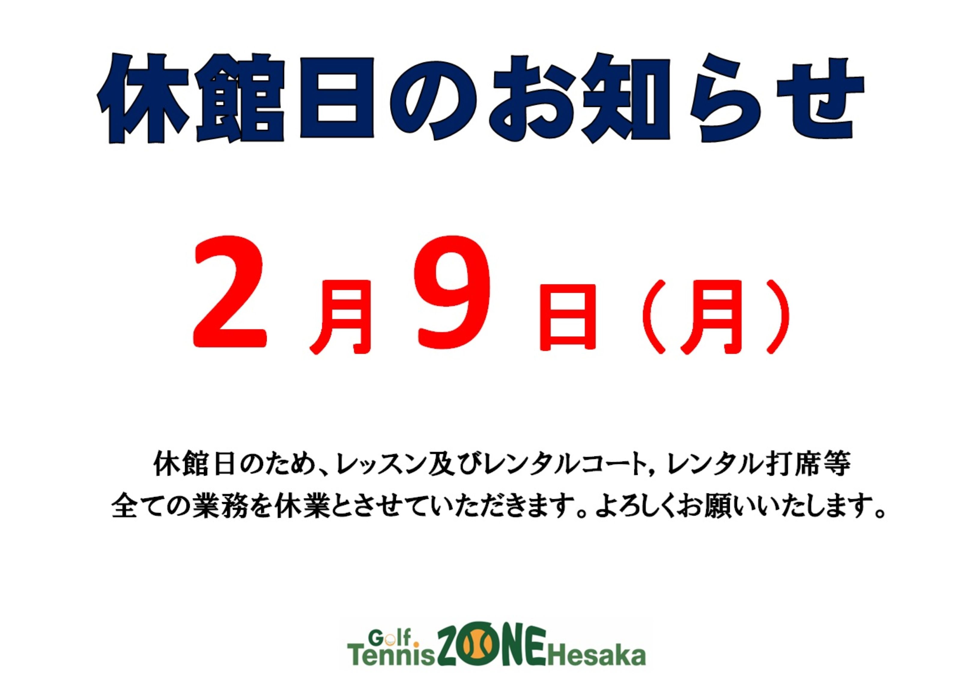休館日のお知らせ | 新着情報 | Golf Tennis ZONE Hesaka