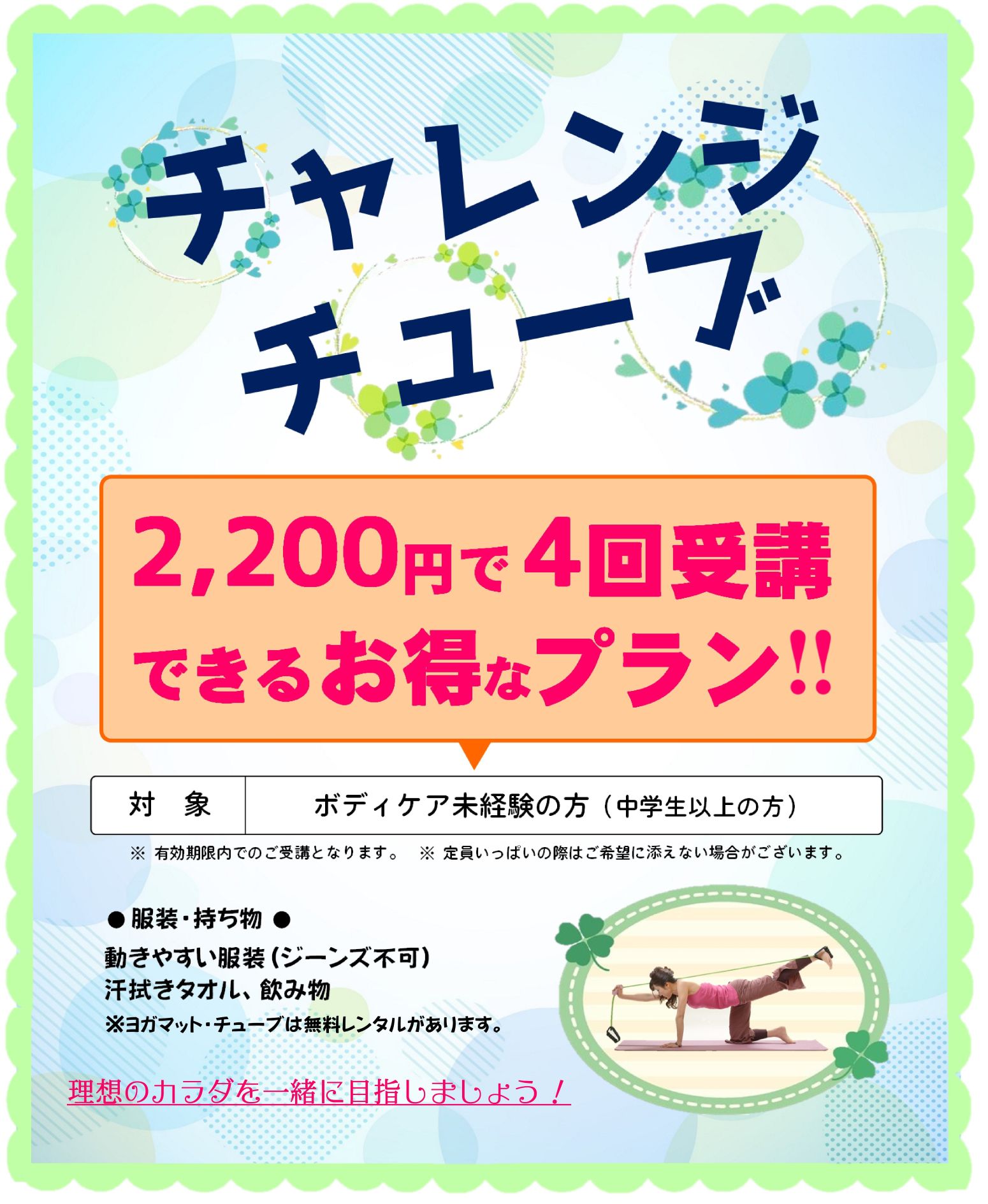 テニス・チューブヨガ未経験の方がレッスン4回を2,200円で受講できるチャレンジ企画です♪